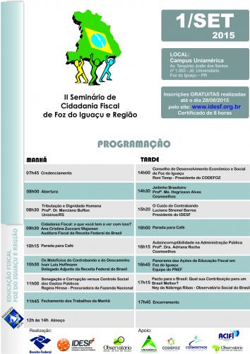 No dia 1.° de setembro será realizado em Foz do Iguaçu - PR o II Seminário de Cidadania Fiscal. O primeiro seminário aconteceu em 2014 e o público alvo eram professores da rede municipal de ensino do município e região. Agora o evento está destinado para a comunidade em geral (escolas, clubes de serviços, funcionalismo público e demais cidadãos).